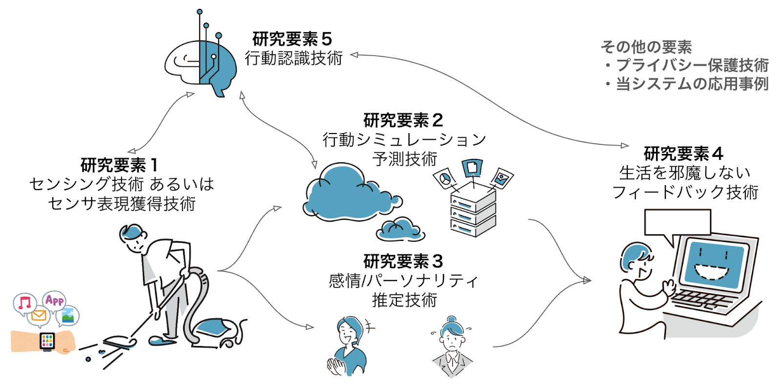 Conventional behavior recognition systems (or systems that provide services based on recognition results) have not been widely adopted due to challenges such as intrusiveness, a sense of surveillance, foreignness, reliability, and recognition accuracy. This theme aims to develop human-centric life support systems based on the principles illustrated in the following diagram.