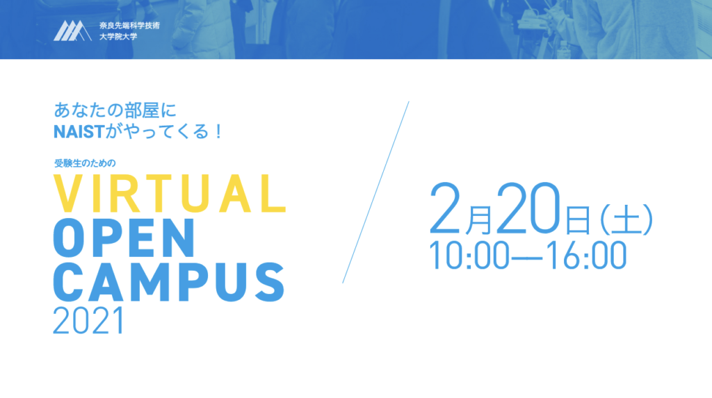 2021年2月20日(土)に、受験生向けのNAISTオープンキャンパスをオンライン開催します。インタラクティブなイベントへの参加には申込みが必要ですので、下記のオープンキャンパス公式ページから事前申し込みをお願いいたします。